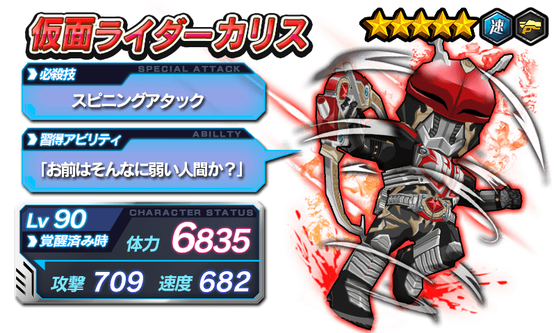★5 仮面ライダーカリス | 速 | 必殺技(Lv最大時):スピニングアタック ・敵2体に600%の自属性ダメージを3回繰り返す リーダーアビリティ:居候のカメラマン ・バトルラッシュ状態時、 速属性の攻撃力20%UP &発動時に必殺技ゲージ上昇 アビリティ:お前はそんなに弱い人間か? ・必殺技に必要なポイントを軽減 | |